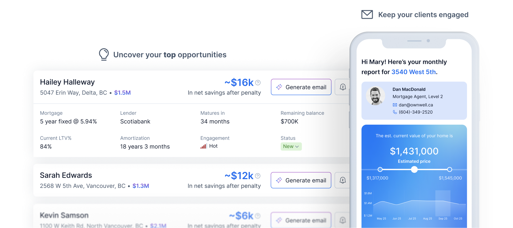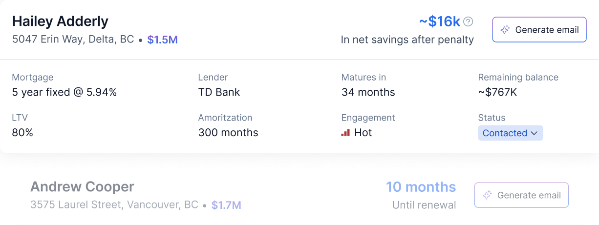 Ownwell continuously monitors your database and flags the clients worth calling. It keeps you top of mind until they’re ready to act, so you reach out before the bank does.